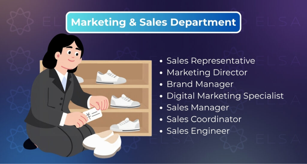 ตัวอย่าง: Marketing Specialist (ผู้เชี่ยวชาญด้านการตลาด), Sales Executive (เจ้าหน้าที่บริหารงานขาย), HR Officer (เจ้าหน้าที่ฝ่ายทรัพยากรบุคคล), Accountant (นักบัญชี), IT Staff (เจ้าหน้าที่ฝ่ายไอที), Customer Service Representative (พนักงานฝ่ายบริการลูกค้า)
