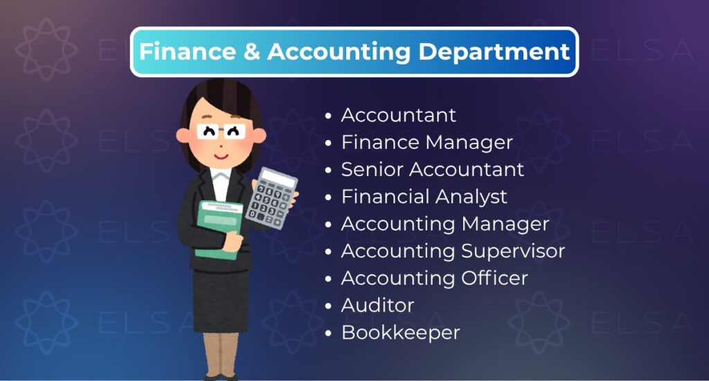 | Finance Manager | /ˈfaɪnæns ˈmænɪdʒər/ | ผู้จัดการฝ่ายการเงิน | The Finance Manager controls budgets and cash flow. |