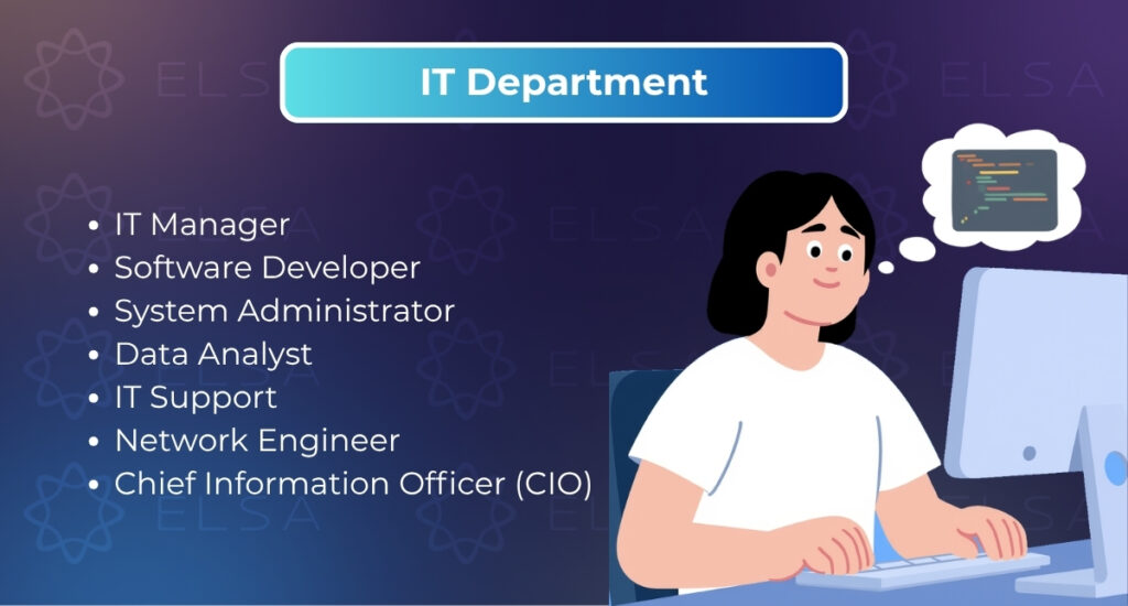 Common departments: Management, Human Resources (HR), Finance & Accounting, Marketing, Sales, Information Technology (IT), Customer Service.