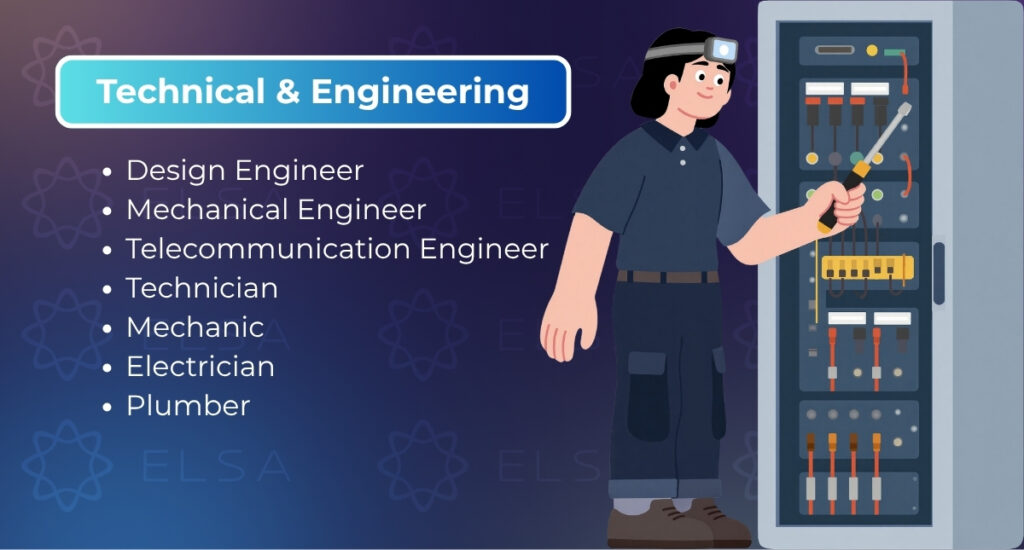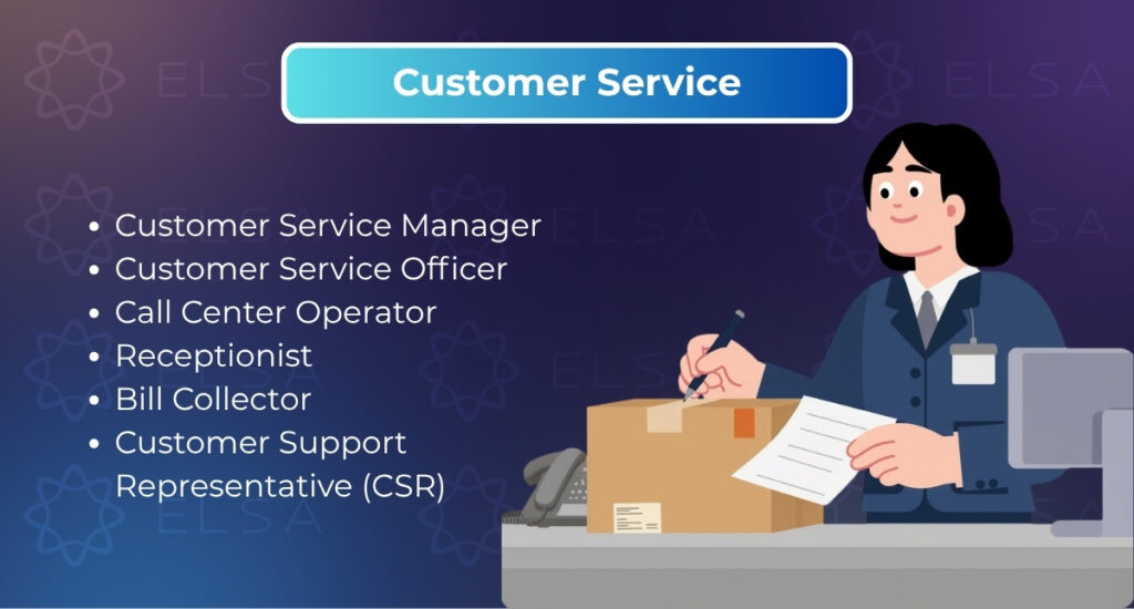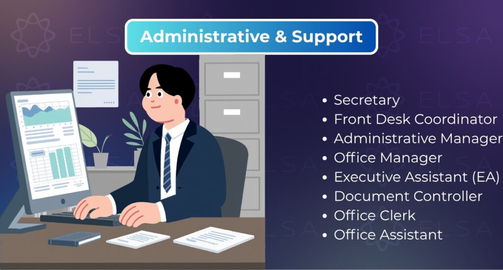 ตัวอย่าง: Administrative Staff – Admin (พนักงานธุรการ), Secretary (เลขานุการ), Receptionist (พนักงานต้อนรับ), Office Assistant (ผู้ช่วยสำนักงาน)