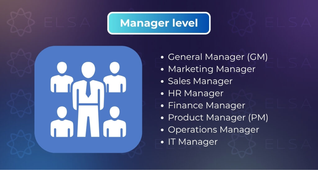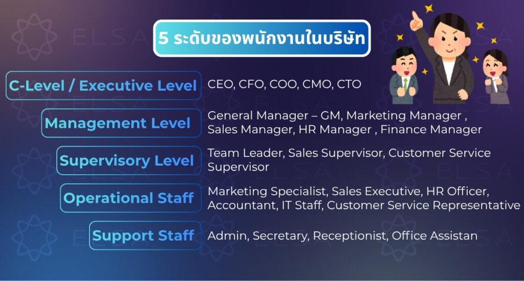 ตัวอย่าง: General Manager – GM (ผู้จัดการทั่วไป), Marketing Manager (ผู้จัดการฝ่ายการตลาด), Sales Manager (ผู้จัดการฝ่ายขาย), HR Manager (ผู้จัดการฝ่ายทรัพยากรบุคคล), Finance Manager (ผู้จัดการฝ่ายการเงิน)