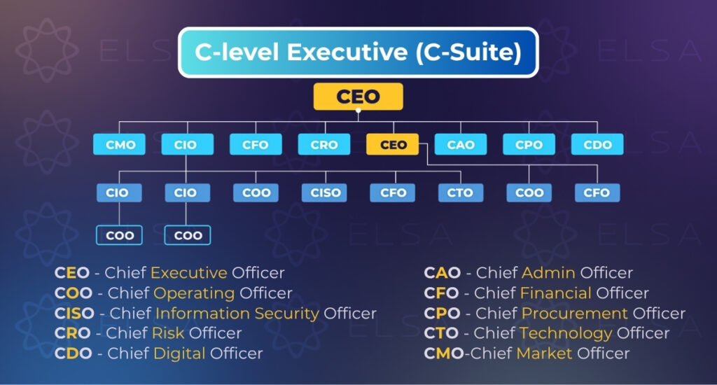 - ระดับผู้บริหาร (C-Level / Executive Level): นี่คือระดับสูงสุดในธุรกิจ รับผิดชอบทิศทางเชิงกลยุทธ์ การตัดสินใจที่สำคัญ และการจัดการองค์กรทั้งหมด