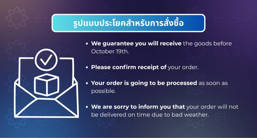 | วัตถุประสงค์ | ประโยคตัวอย่าง | ความหมาย |