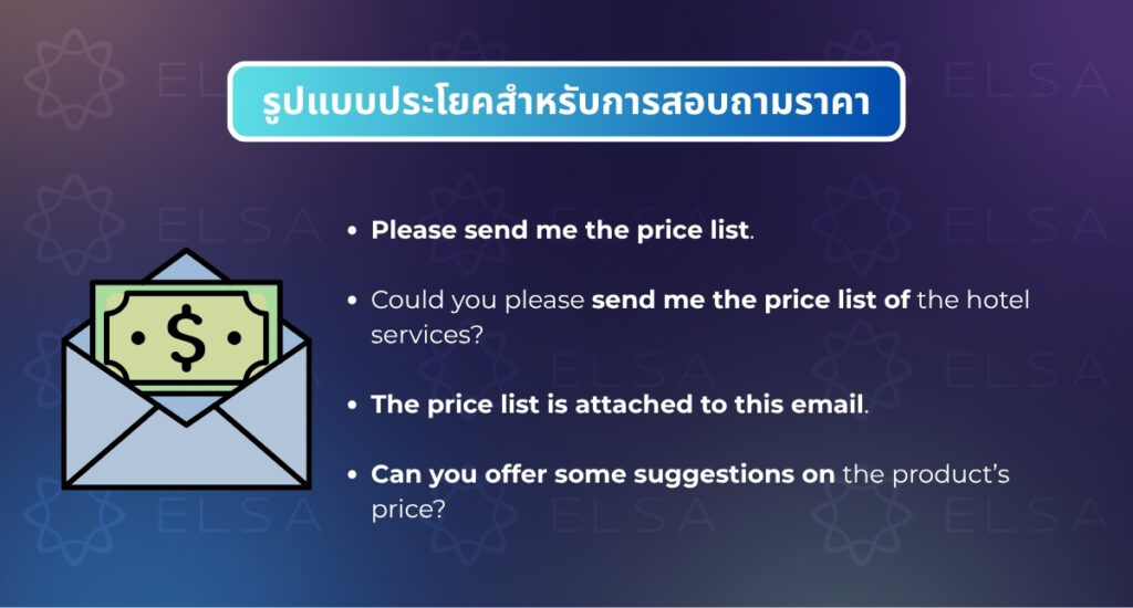 - I am writing to enquire about… (“ฉันเขียนอีเมลฉบับนี้เพื่อสอบถามเกี่ยวกับ…”): ใช้โดยเฉพาะสำหรับจุดประสงค์ในการสอบถามข้อมูลหรือขอใบเสนอราคา