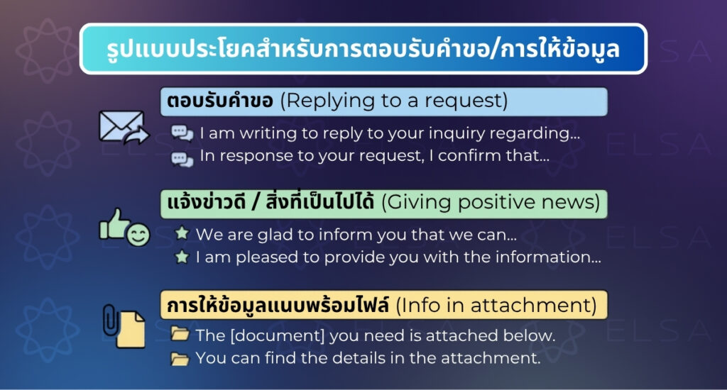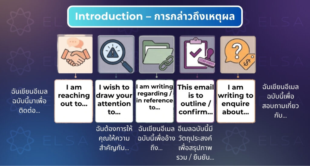 นอกเหนือจากโครงสร้างพื้นฐานอย่าง “I am writing to…” คุณควรเลือกใช้ตัวอย่างประโยคด้านล่างนี้อย่างยืดหยุ่น เพื่อให้โทนเสียงของข้อความเป็นธรรมชาติและเป็นมืออาชีพมากขึ้นตามแต่ละบริบท ดังนี้: