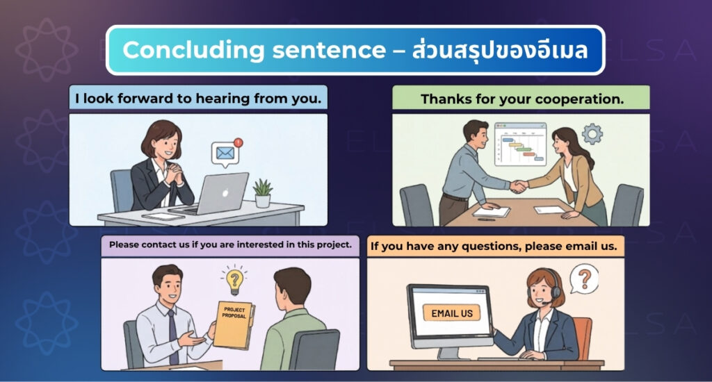 - This email is to outline / confirm… (“อีเมลฉบับนี้มีวัตถุประสงค์เพื่อสรุปภาพรวม / ยืนยัน…”): เป็นการสื่อสารแบบตรงไปตรงมา เข้าสู่ประเด็นโดยไม่ต้องใช้คำฟุ่มเฟือย