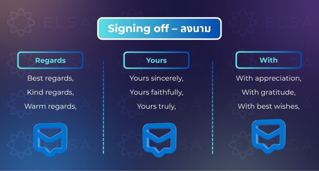 | Subject (คำลงท้าย):[เนื้อหาโดยย่อ] (ตัวอย่าง: Meeting update / Quick question) Salutation (คำขึ้นต้น): Hi [ชื่อ] / Hello [ชื่อ], Opening (ส่วนเปิด): Hope you’re doing well. (หวังว่าคุณจะสบายดี) / Just a quick note to… (แค่จะทักมาบอกสั้น ๆ ว่า…) Body (เนื้อหาหลัก): – Just wanted to let you know that… (แค่จะบอกให้คุณรู้ว่า…) – Can you help me check…? (คุณช่วยเช็ค… ให้หน่อยได้ไหม?) Closing (ส่วนท้าย): – Thanks! (ขอบคุณนะ!) – Talk to you soon. (ไว้คุยกันนะ) Sign-off (คำลงท้าย): Best / Cheers, [ชื่อเล่นหรือชื่อสั้น ๆ ของคุณ] |