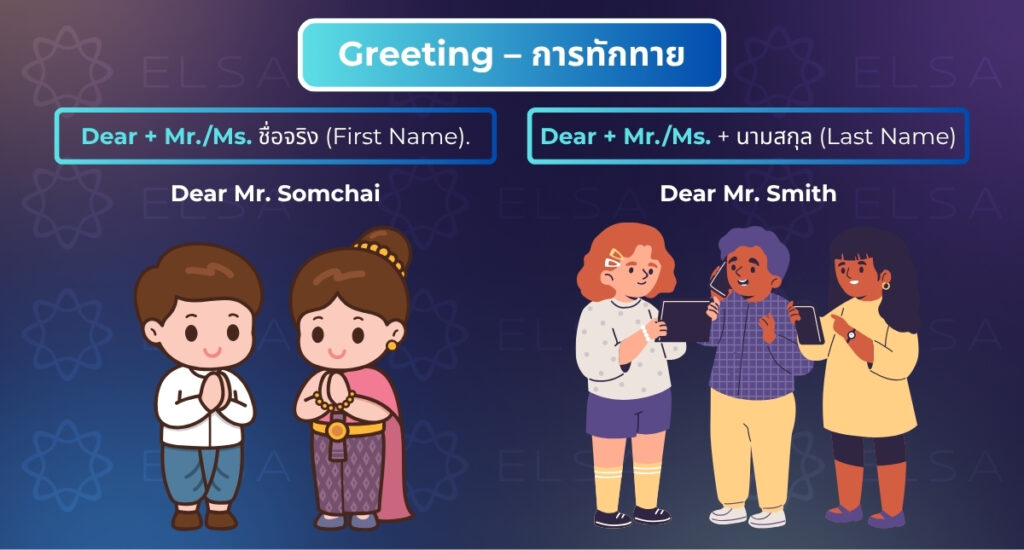 - ควรใช้: Dear + Mr./Ms. + นามสกุล (Last Name).