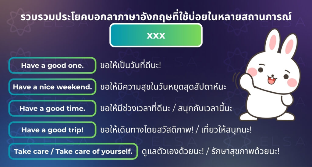 | Have a good day/ nice day/ good night! | ขอให้เป็นวันที่ดี/ขอให้เป็นคืนที่ดี |