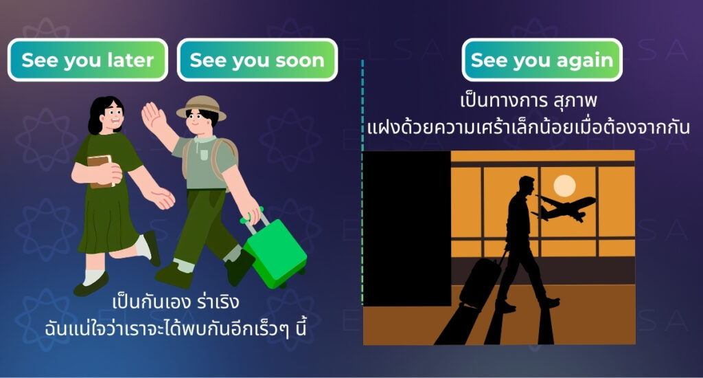 แม้ว่าคำว่า see you soon, see you later และ see you again จะมีความหมายว่า “see you again” เหมือนกัน แต่ทั้ง 3 สำนวนนี้มีความแตกต่างกันอย่างมากในด้านของเวลาและความรู้สึก ซึ่งผู้เรียนภาษาอังกฤษมักจะสับสนอยู่บ่อยครั้ง
