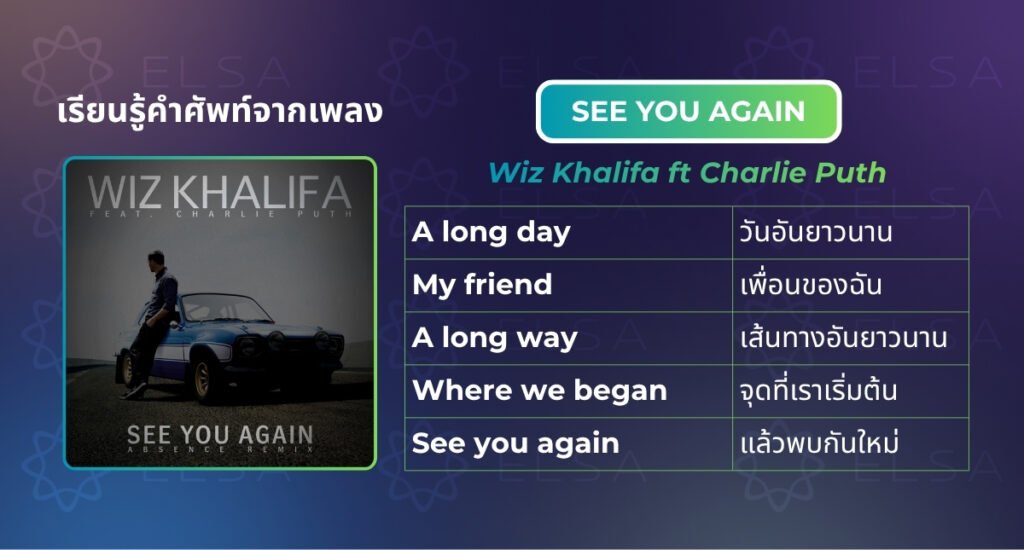 คุณสามารถรับฟังทำนองที่เต็มไปด้วยความรู้สึก และวิธีการออกเสียงที่ถูกต้องของวลี “See you again” (MV) ด้านล่างนี้: MV See You Again