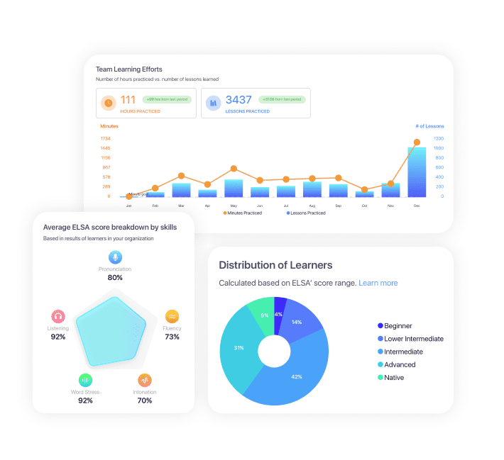 ด้วยหลักสูตรภาษาอังกฤษสำหรับโรงเรียนของ ELSA ครูและผู้บริหารสามารถจัดห้องเรียน เข้าถึง และติดตามความก้าวหน้าของผู้เรียนแต่ละคนอย่างใกล้ชิดโดยง่าย ในขณะเดียวกัน คุณสามารถติดตามระยะเวลาและบทเรียนที่เรียนแล้วของห้องเรียน/ชั้นเรียน/แผนกรวมทั้งหมดผ่านรายงานเชิงลึก ได้แก่