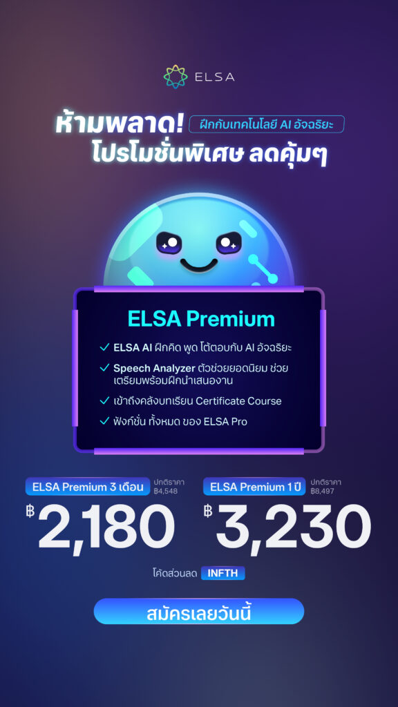 กรอกโค้ด INFTH เพื่อรับดีลสุดเอ็กซ์คลูซีฟสำหรับนักเรียน ELSA เท่านั้น