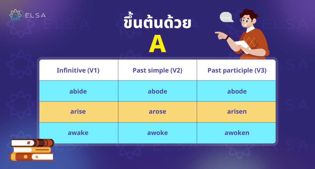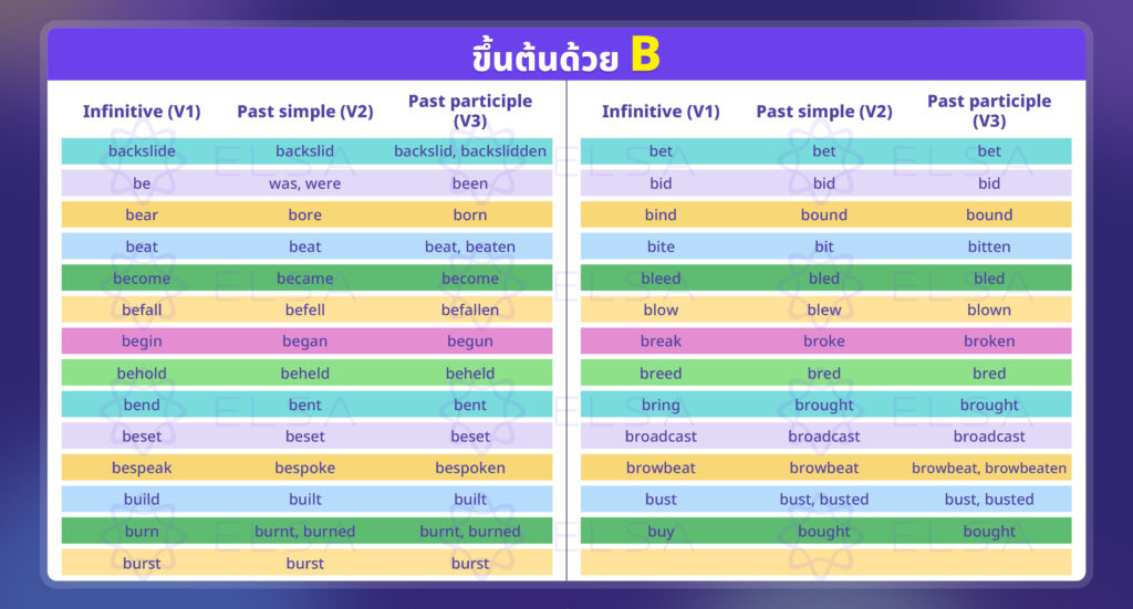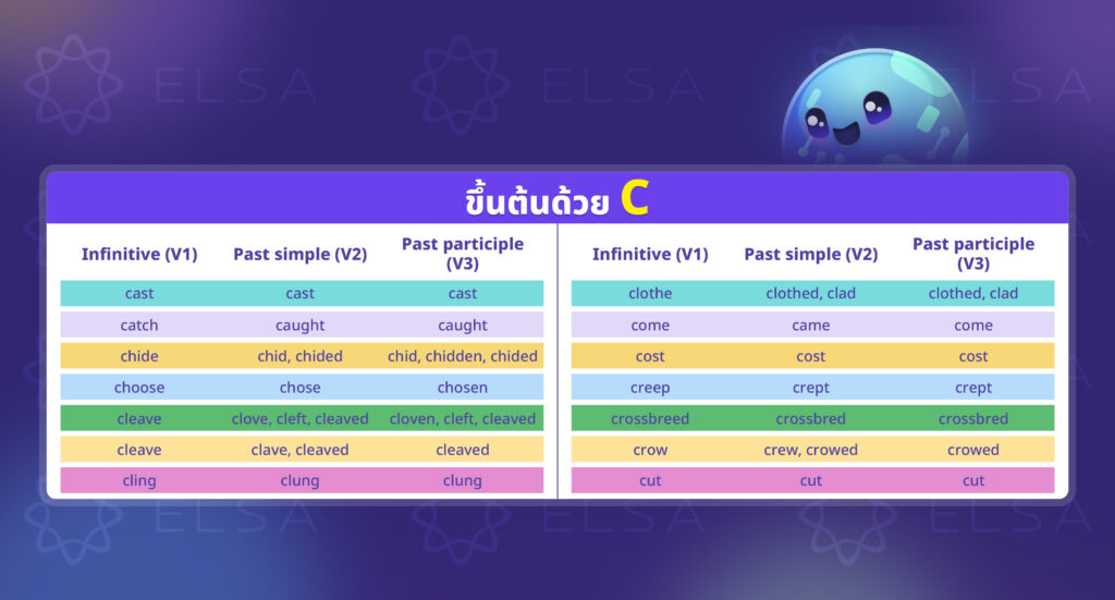 ในความเป็นจริง มี Irregular Verbs มากกว่า 600 คำ แต่มีเพียงประมาณ 360 คำเท่านั้นที่ใช้บ่อยในการสื่อสารในชีวิตประจำวัน ในตารางต่อไปนี้ ELSA Speak สรุป 360 คำ Irregular Verbs พร้อมคําแปล ที่ใช้บ่อยที่สุด