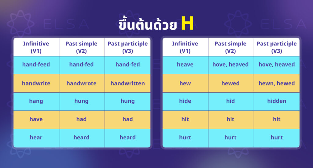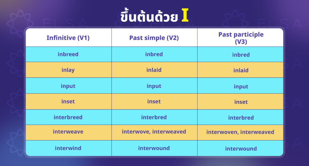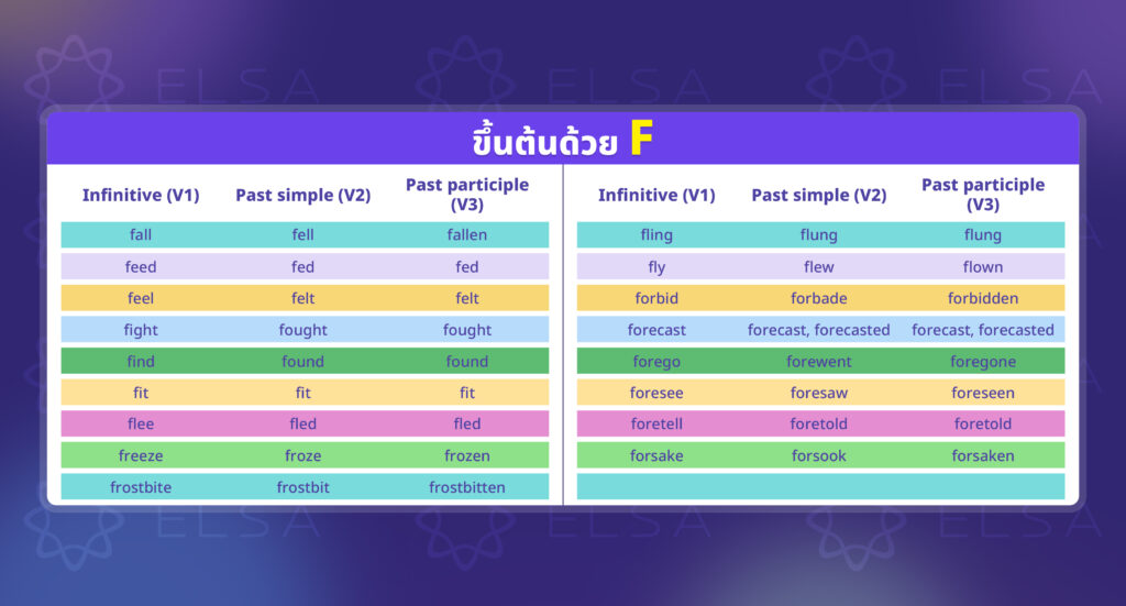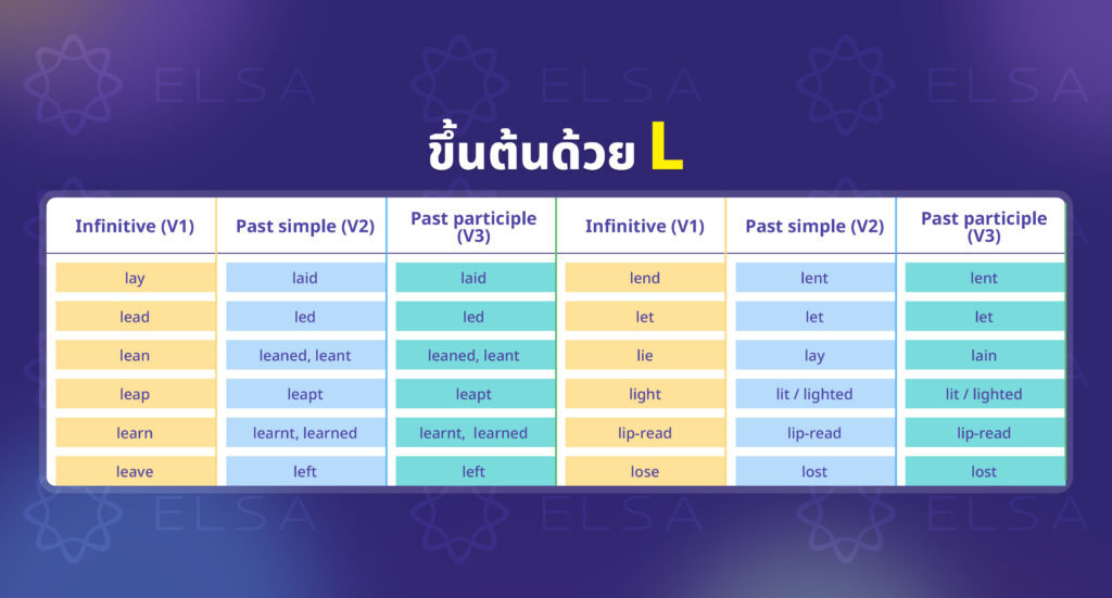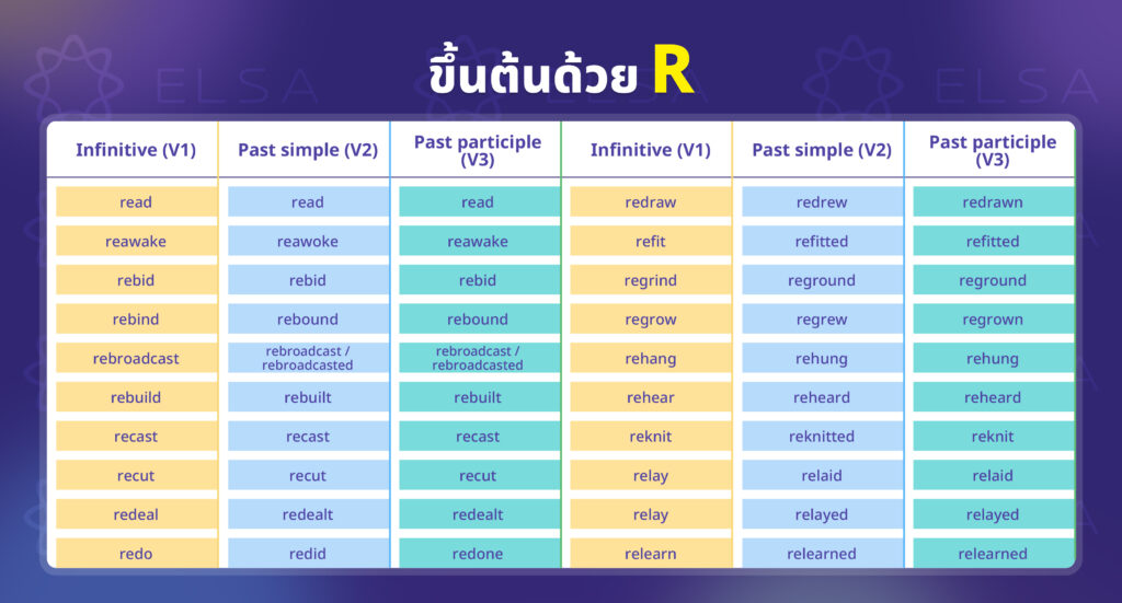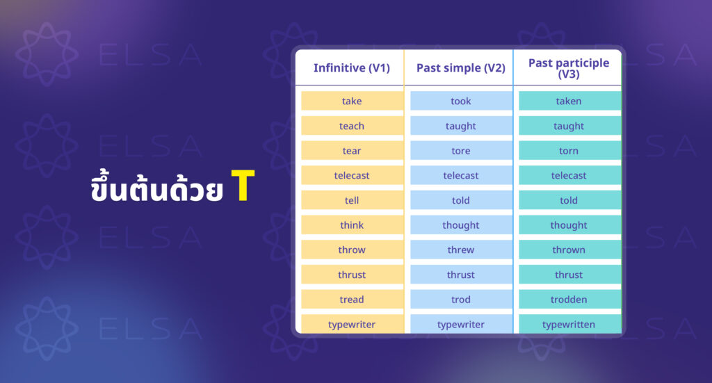 | Infinitive (V1) | Past simple (V2) | Past participle (V3) | ความหมาย |